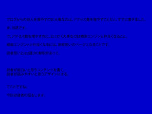みなさん、こんにちは! B-CHANです。 ブログからの収入を増やすのに大事なのは、アクセス数を増やすことだと、すでに書きました。 ま、当然です。 で、アクセス数を増やすのに、とにかく大事なのは検索エンジンと仲良くなること。 検索エンジンとと仲良くな…