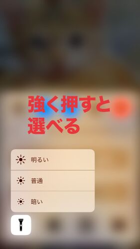 フラッシュライト iPhoneに付いているフラッシュライト。 これです。 このフラッシュライトの明るさを調整できるようになったんですよ。 iPhoneの画面の一番下から上にスワイプすると、コントロールセンターが出てきます。 その左下のボタン。 これがフラッ…